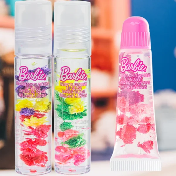 Add a touch of glam with Barbie Floating Floral Lip Gloss ? a trio of scented glosses that shine and moisturize. Decorated with Barbie and friends, each gloss offers a fun flavour and vibrant colour. Made with naturally derived ingredients, it?s safe and gentle for young lips. Perfect for mixing and matching, this set encourages creativity and confidence. From a brand loved by generations, it?s a stylish way to sparkle. Let her shine like a true diva today!