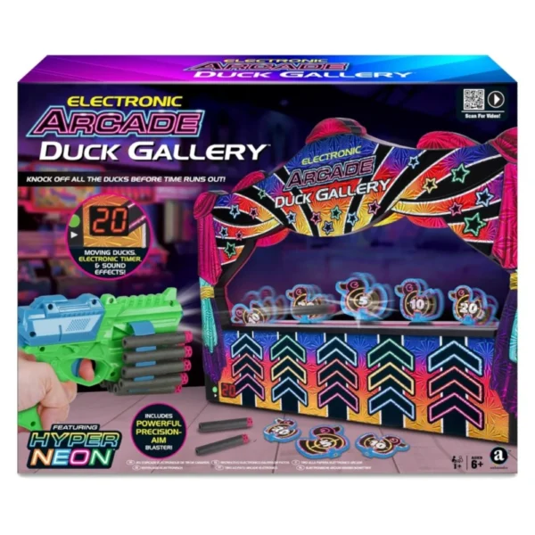 Step right up, step right up! Everyone’s a winner in this fun and exciting version of the classic duck gallery shooting game! Just like the carnival & arcade versions, the objective is to knock over as many ducks as you can in 60 seconds. Each duck rotates around the stage along the moving conveyor belt, increasing the challenge. The ducks also come in 3 sizes each with a different point value, so take careful aim at the smallest ones to increase your score! Carnival music and duck quacking sounds add to the atmosphere, while the bright LED timer lets you know how much time is remaining. Once you’re done collect the ducks and tally up your score. Replace the ducks on the belt and you’re ready to play again – everyone can take turns trying to set a new record! Comes ready to play with a blaster & darts. For 1 or more players. Requires 3 x AA batteries (not included). Recommended for ages 6 and over.