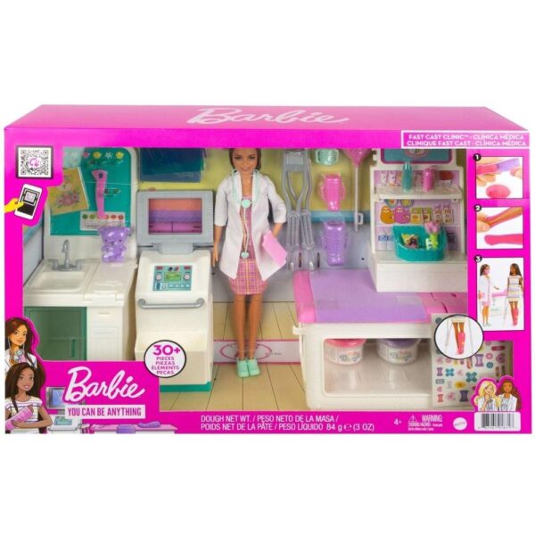Explore a world of caretaking fun with the BarbieFast Cast Clinic playset! When girls play with Barbie they imagine everything they can become, and for those that love taking care of others, they can run a Fast Cast Clinic! The clinic includes a brunette Barbiedoctor doll (12-in/30.40-cm) and 4 play areas: a medical station, exam table, X-ray machine and gift shop. Kids can make casts for their doll “patient” (sold separately) with a realistic cast making feature (use pink, purple or white dough) to create casts for the patient’s arms and legs and create wraps with the bandage maker. Playset also includes 30+ pieces to play out the fun: 3 dough containers, leg cast, Chelsea arm cast, a set of crutches, stickers, X-rays, gift shop items and more. Some of the accessories feature a clip so Barbiedoctor doll can hold them for even more realistic play! Kids will love the endless possibilities for creative expression and storytelling fun! Doll cannot stand alone. Colors and decorations may vary. Makes a great gift for ages 3 and up.