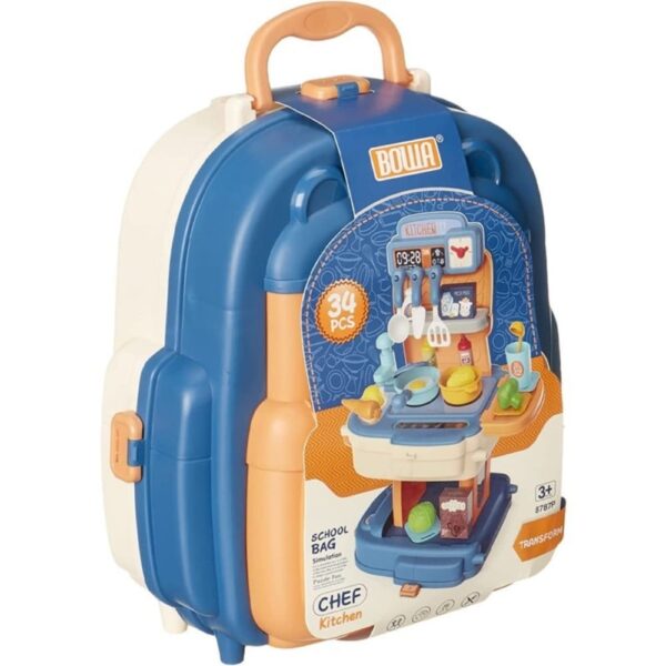 The Bowa School Bag Chef Kitchen Set in Blue is a comprehe isive kitchen playset that includes 34 pieces. It is designed to resemble a school bag, making it convenient to carry and store.