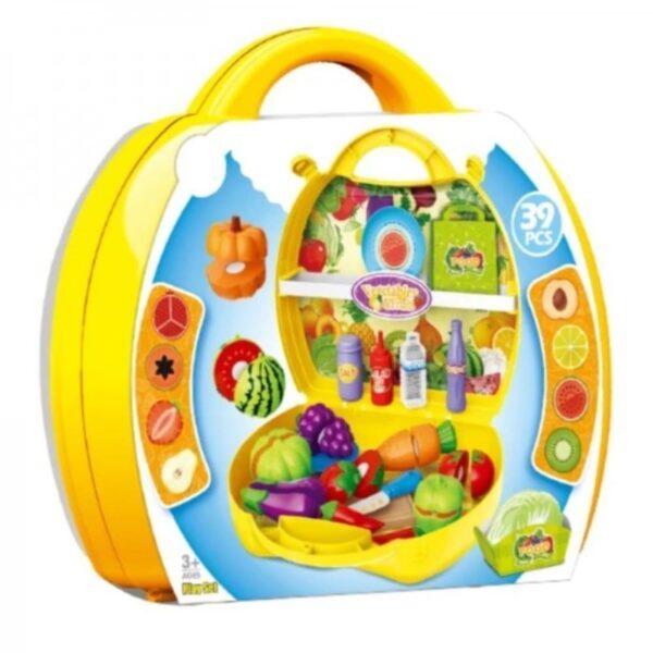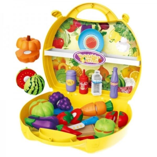 Childrens pretend play food set featuring vegetables and fruits. Designed for imaginative play, allowing children to play with realistic-looking toy food. Most likely includes a variety of plastic replica vegetables and fruits in different colors and shapes. May come in a basket or plastic container for storage.