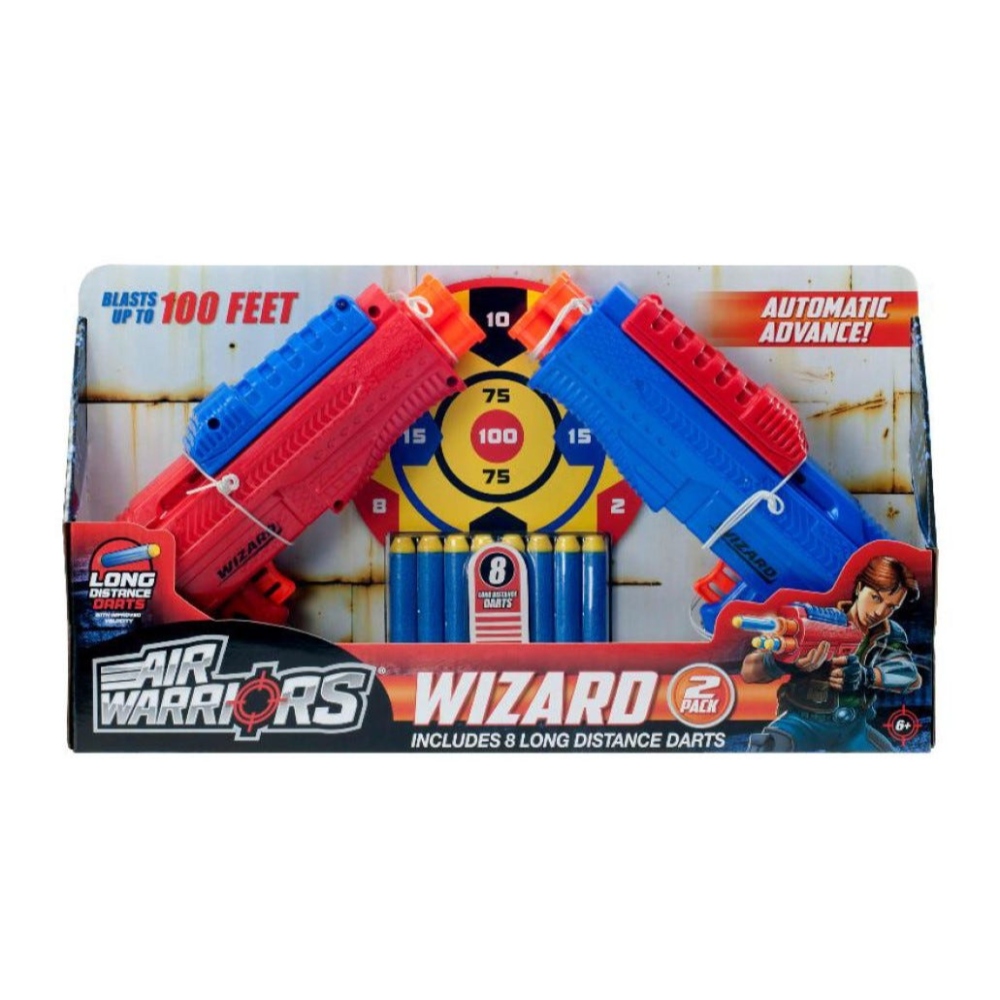 The Buzz Bee Air Warriors Wizard 2 Pack offers an exciting, high-action dart blasting experience for you and a friend. Designed for fun and competitive play, this set includes everything you need for epic duels and target practice.