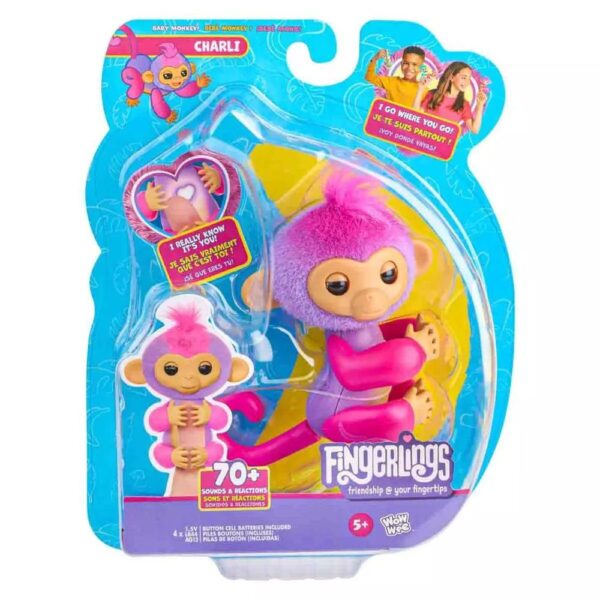 The brand-new Fingerlings Monkey Purple Charli will have you going crazy while Revealsng friendship at your fingertips. Over 70 sounds and behaviours are included in these beautiful, interactive baby monkeys. This interactive monkey toy is incredibly cuddly and has soft fur on its heads. Each new Fingerlings character has a distinct personality and voice. They are very aware of their presence on your finger! Just see how your interactive monkey toy reacts to being on or off your finger and how their heart glows. Charles, welcome! Off your finger, you silly prankster who enjoys pulling practical jokes. She’s your adorable, giggling best friend on your finger. BANANA! The sensors on this Fingerlings monkey’s head, mouth, and belly react to your touch. They can be fed, kissed, petted, and more.