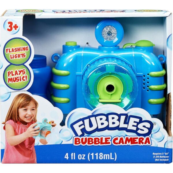 This set includes the Fubbles Bubble Camera in Blue with Music and Lights and our Premium Fubbles Non-Toxic Bubble Solution. Requires 4 AA batteries, NOT included.
