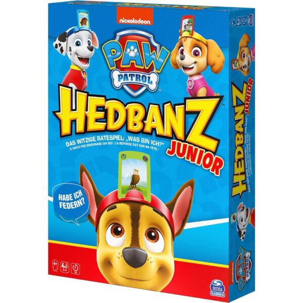 In HedBanz Junior: Paw Patrol, players don colorful headbands with a card attached that they cannot see. Each card features a character from Paw Patrol or an animal from Adventure Bay. Players take turns asking yes or no questions to help them figure out which character they are wearing on their headband.