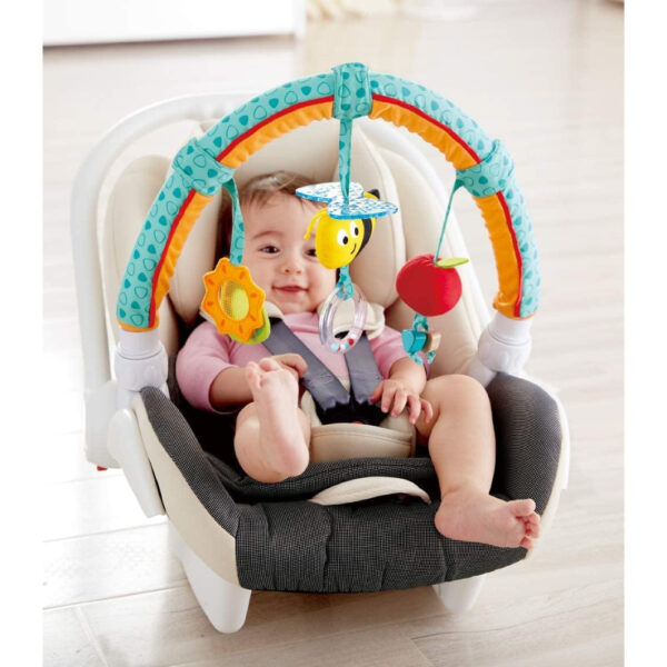 Design: The arch is adorned with vibrant garden-themed toys, including a bee with translucent wings, a felt apple, a sunflower, and a leaf.