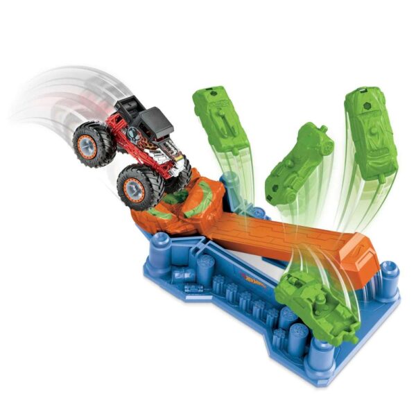Complete play in a box! Kids use the launcher to aim their 1:64 scale Monster Truck at the platform landing zone for exciting crashing action. ?The platform is loaded with four crushed cars and when the Monster Truck Bone Shaker hits the trigger spot just right the car-splosion is epic!