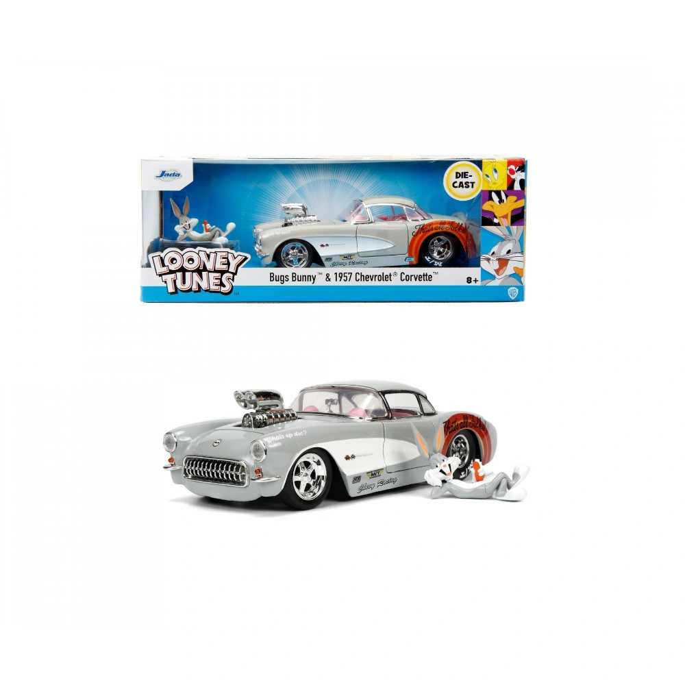 Eh, What’s up Doc? Bugs Bunny has inspired this 1956 Chevy Corvette and you can add it to your collection. This die-cast ride was made for Bugs as the sleek white side panel mimics his furry white stomach. Logos and decals adorn the vehicle and the tires. Designed with precision, using quality heavy die-cast metal, the vehicle features working wheels, premium rubber tires, opening hood, doors, and trunk and a 100% die-cast Bugs Bunny figure.