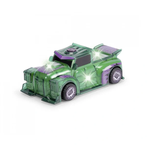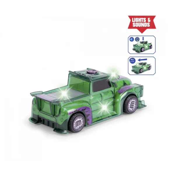 Jada Toys MARVEL Light Hero Hulk car (15 cm) – Superhero toy car with friction and cool light & sound effects, car toys for kids age 3+, incl. batteries Heroic force of nature on 4 wheels Experience the incredible power of the Hulk ? in the shape of a car in an imposing truck design! Just like the superhero Hulk himself, the 15 cm MARVEL vehicle attracts attention with its striking shape and striking green hue. The large tyres, decorated with powerful fist motifs, underline the concentrated power of the legendary comic book hero. Friction drive with smash effect A good push is enough to activate the friction drive of the MARVEL Light Hero and unleash the unbridled energy of the green titan: The officially licensed MARVEL car toy rolls on by itself, as if it were being pushed by the Hulk, aka Dr. Bruce Banner, himself ? a fun driving adventure for little superheroes from the age of 3!