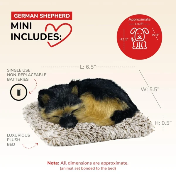 Enjoy real-life interaction with your animated stuffed animals without the cumbersome and pricey upkeep. The Original Petzzz Mini German Shepherd is a gentle and calm companion pet for all ages. Anyone of any age will love these oh-so-adorable fur toys for kids and adults. This ?snoring dog? is a great substitute for an actual dog, especially in senior communities, nursing homes, and assisted living facilities. You can even take your ?snoring stuffed animal dog? to the office or keep them in condominiums and dorms with pet restrictions. It measures approximately 4.5 x 3 x 1.5 inches. And they have synthetic fur that feels like the real deal!