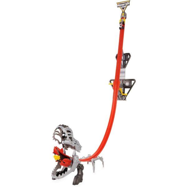 Load up your Monster Jam trucks and crank the handle to watch them ascend the towering playset. Once at the top, release the truck to perform incredible stunts including a high jump, front flip, and corkscrew as it launches from the Dino’s mouth, complete with thrilling lights and sounds!