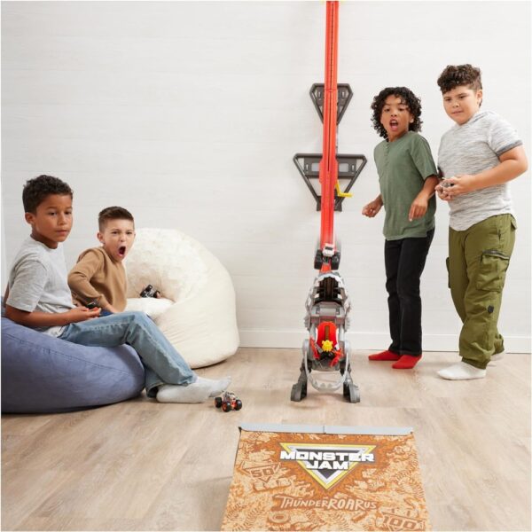Get ready for action with the Monster Jam ThunderROARus Drop Playset! Standing an impressive 6 feet high, this is the tallest Monster Jam playset ever, designed to bring epic stunts right into your home.