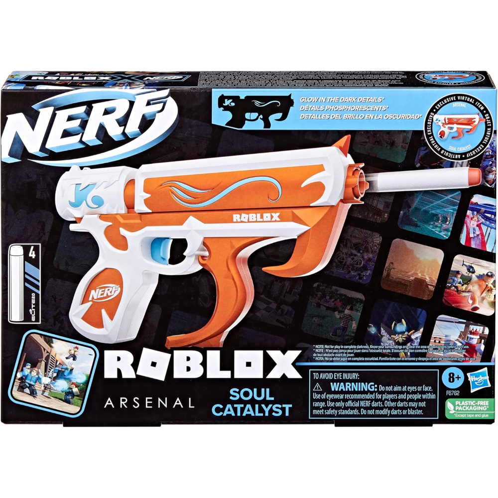 This Nerf Roblox Arsenal: Soul Catalyst blaster takes its inspiration from the Roblox experience Arsenal by ROLVe Community! This dart blaster includes a special code that allows you to redeem an exclusive virtual item on Roblox.* The Soul Catalyst blaster features easy pull-back priming to launch you into exciting outdoor play. Simply pull the slide back and release it, allowing the slide to spring back by itself. Pull the trigger and let the dart fly in outdoor games! Cool glow-in-the-dark details** on the blaster add an awesome look to your Nerf games. The blaster has single-dart capacity and easy front-loading. It comes with 4 Official Nerf foam darts. Launch into Nerf battles with the Nerf Roblox Arsenal: Soul Catalyst foam dart blaster for outdoor play! Eyewear recommended (not included). Copyright 2023 Roblox Corp.?ROBLOX is a registered trademark.?All rights reserved. Hasbro and all related terms are trademarks of Hasbro.
