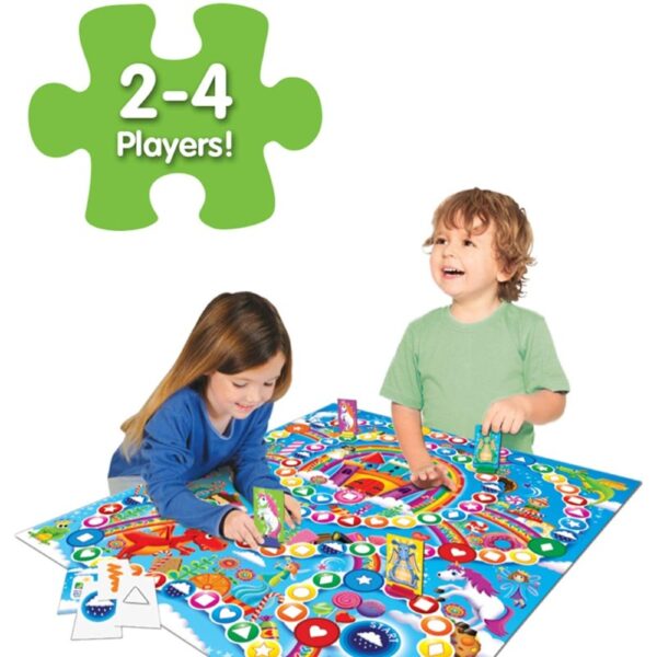 Race to the Rainbow is an engaging and educational board game designed to help children recognize colors and shapes while having fun. Players choose their character—either a unicorn or a dragon—and embark on a colorful adventure to reach the rainbow castle. This whimsical game combines elements of chance and strategy, making it a delightful experience for kids aged 3 and up.