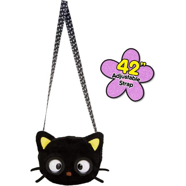 The Purse Pets Sanrio Chococat is an adorable, kawaii-inspired purse that features Chococat’s signature look—fluffy black fabric, pointy ears, and an embroidered nose with whiskers. Designed with an adjustable printed strap that extends up to 42 inches, this larger-sized purse is perfect for kids and Sanrio enthusiasts of all ages.
