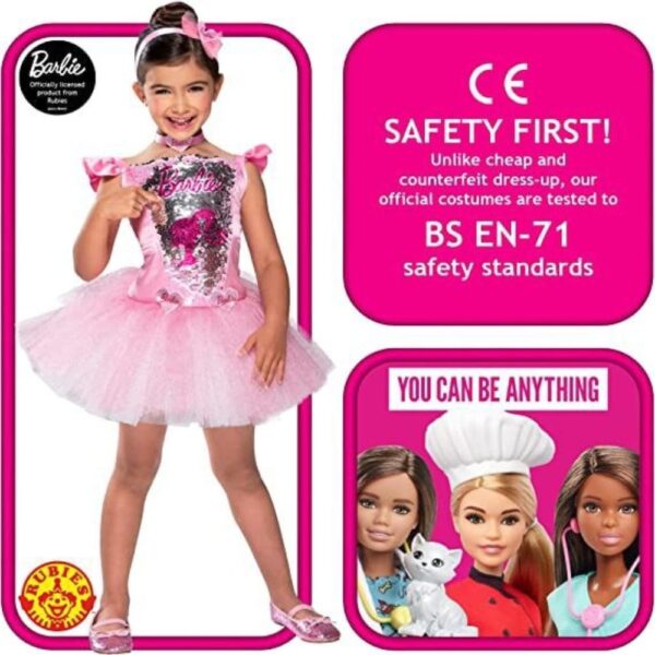 Official BarbieProduct from Rubies Costumes. Ballerina BarbieKids Costume, includes Barbiebranded ballerina pink tutu dress, sequin bodice with a reverse pattern, and matching headpiece.