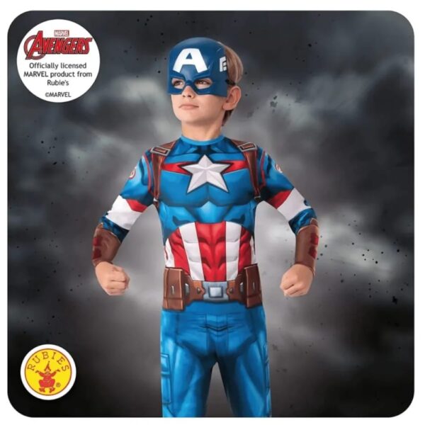 Marvels official childrens Captain America costume by Rubies. Recipient of the isuper-Soldier serum, worldWar II hero Steve Rogers (or Cap to his friends), became one of the world mightiest heroes and the leader of the Avengers. A decorated costumed champion for all ages, Caps unique uniform has been made to fit even the ismallest Hero. This iconic costume features a detailed designed jumpsuit with attached shoe covers and half mask. Dress up as Cap for Super Hero parties, Halloween or just saving the day, every day!