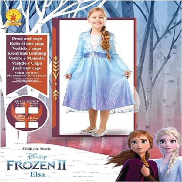 Official Rubie’s product from the Disney Frozen 2 Range. Get ready for Frozen 2 adventure. Classic Elsa Dress with sequins detail to the bodice, a metallic snowflake on the belt and an organza cape with glitter print. Rubies is the largest designer, manufacturer and distributor of fancy dress. Founded in Queens, New York, in 1951 by newsagents Rubin and Tillie Beige.