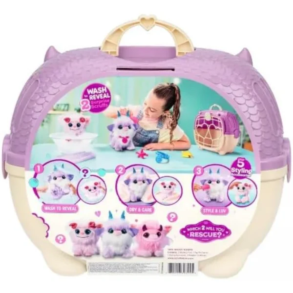 Bring home twice the love with the Scruff-A-Luvs Twin Fantasy Scruffs! Hidden inside messy fur are two adorable mystery pets waiting to be rescued. Wash, dry, and groom your twins to reveal their unique fantasy styles?then accessorize them with matching clips and collars. Each set includes a deluxe twin carrier and adoption certificate for a complete rescue experience full of imagination and care.