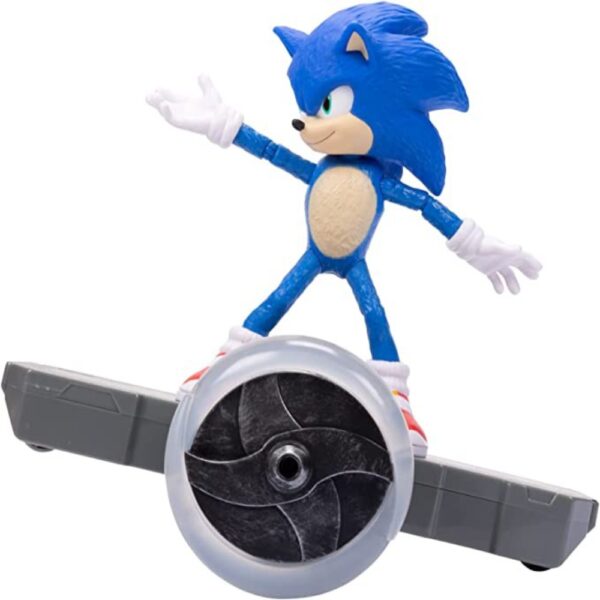 How fast can you go with the Sonic Speed R/C? Recreate the action from the Sonic the Hedgehog 2 movie as Sonic races to save the world and confront Robotnik! This R/C includes a six-inch scale detachable Sonic figure, R/C rider, and ring controller. The controller is inspired by Sonic?s rings from the movie and has 3 buttons for total control: go forward, turn and 360-degree spins, and Turbo mode that lights the wheels up for that extra boost! Sonic Speed R/C is approximately 1:5 scale with design inspired by the movie. The removable Sonic figure is over 6-inches tall and has 13 points of articulation for awesome poses. Take your R/C and have fun on the go! This R/C requires 8 AA batteries. It has a range of 100 feet and works best on flat and smooth surfaces. It uses a 2.4GHz frequency.