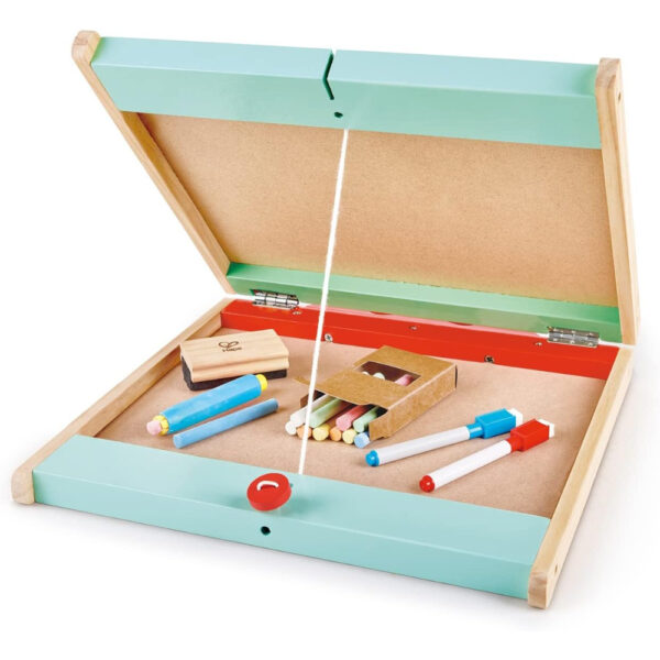 The Hape Store & Go Easel is a versatile 3-in-1 tabletop art station designed to inspire creativity in young artists. This compact easel features a chalkboard on one side and a magnetic whiteboard on the other, offering multiple surfaces for drawing, writing, and learning activities. Its foldable design with a secure latch transforms it into a portable carrying case, making it ideal for travel and easy storage.