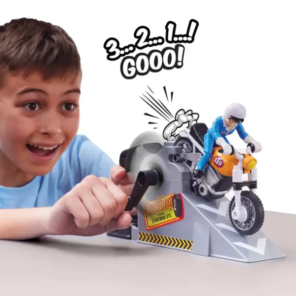 Get ready to take charge as you rev up Stuntman Stu’s Nitro Boost Stunt Bike for an adrenaline-filled adventure. With the easy-to-use rev launcher, you supply the power to send Stu zooming across ramps and straight into the action. Will Stu soar high over the wall with unmatched skill, or will he come crashing down in his signature spectacular fashion?