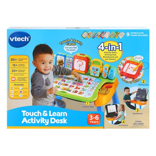 The Touch & Learn Activity Desk by VTech? is a four-in-one desk that features writing pad, desk, blackboard and art station! Desk includes an interactive desktop, stylus and 4 double-sided touch pages filled with engaging content including letters, numbers, music, colours and much more. It also transforms from a desk into an easel and blackboard with plenty of storage space for art supplies to encourage play and discovery. The interactive LED display teaches letter and number stroke order. Also includes fun toy phone and music player featuring over 20 songs. Enjoy hours of fun as you create, discover and learn!