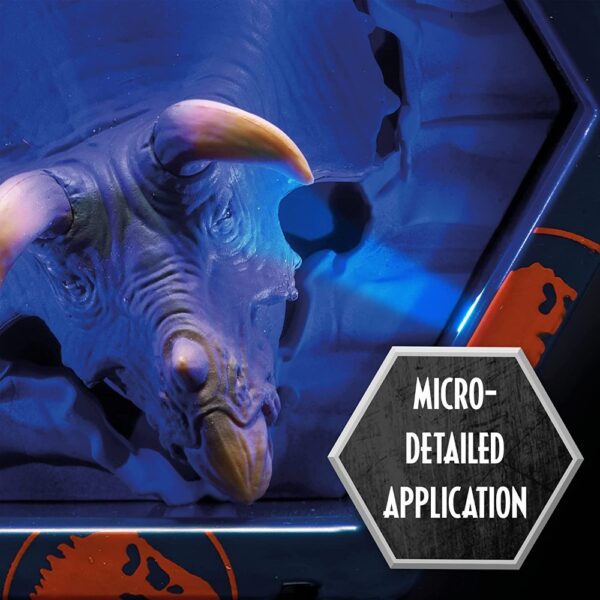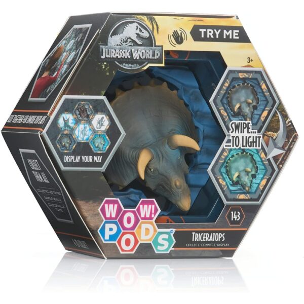 Designed for fans of all ages, the Triceratops WOW! POD is part of a collection that includes other beloved characters like the T-Rex, Blue the Velociraptor, and the Mosasaurus. Each hex-shaped POD is equipped with built-in UV lights and sound effects, ensuring an engaging and interactive display.