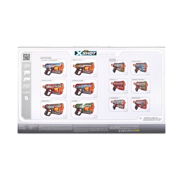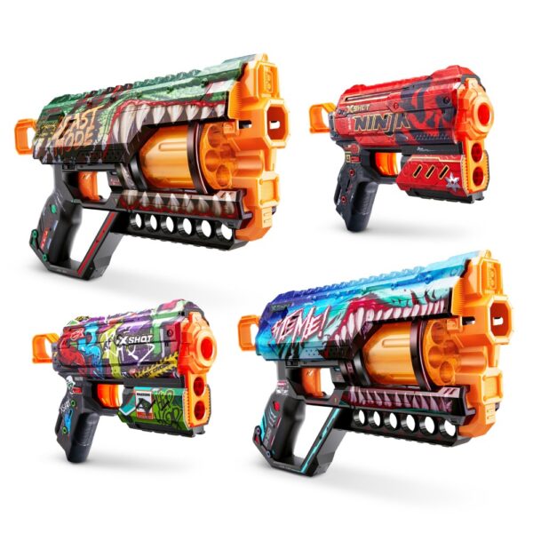 The X-Shot Skins Combo Pack features a unique street battle aesthetic, utilizing advanced printing technology to offer custom-designed blasters. This pack includes two Griefer and two Flux blasters, perfect for taggers and competitive players alike.